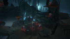 The Festering Cove is a separate large cavern in the Underdark located beneath the general level of the region. It features several waterfalls and rocky cliffs descending to the subterranean water stream, and is scattered with giant mushrooms and adorned with fishing nets and various shells and conches.
