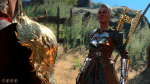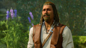 Speaking to Gandrel, the party can find out that he came to this area to get some help from a local hag. Further in the dialogue, the party may inquire about his prey, but must pass a DC 20 Intimidation Check or DC 15 Persuasion Check to make the hunter reveal his target. If successful, it is possible to choose whether to stand by Astarion or to turn him in. Either way, the Gur asks the way to their camp to finish his task (see below).