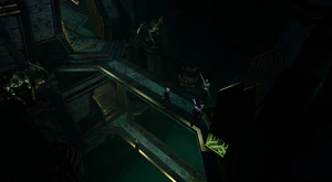 Within Cazador's dungeon, a lower level can be reached using Misty Step or Fly to jump down the hallway to the northwest of the elevator. Here, the Pelorsun Blade can be found in a room to the east, in a buried and trapped rosewood casket at X: -1926 Y: 853. This weapon deals radiant damage, which is highly effective against Cazador. Additionally, a locked ( DC 30 Sleight of Hand Check) door here connects to the Lower City Sewers - Gloomy Ascent.