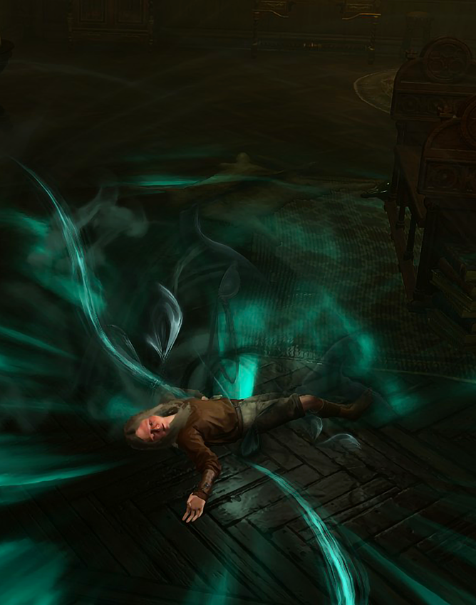While at the palace, Leon became fearful for Victoria's life as other spawn showed interest in her. As a Sorcerer, he imbued her with a counter-curse in the event of an attack against her person, making her a "necrotic booby-trap".[2]