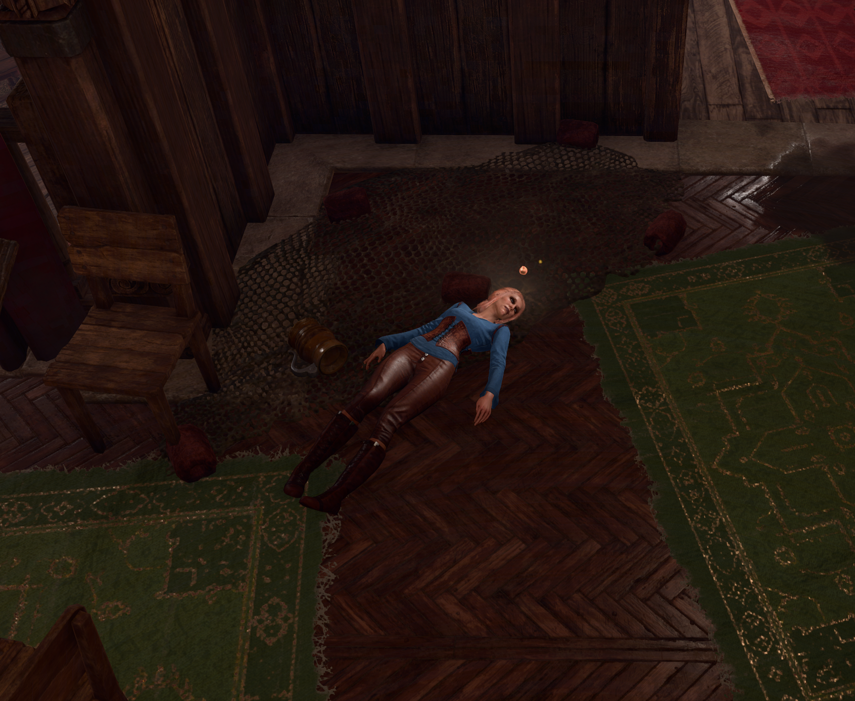 Vin Dorgo can be found drunk and unconscious on the second floor of The Blushing Mermaid. She remains this way even if combat starts, and cannot be spoken to or interacted with.