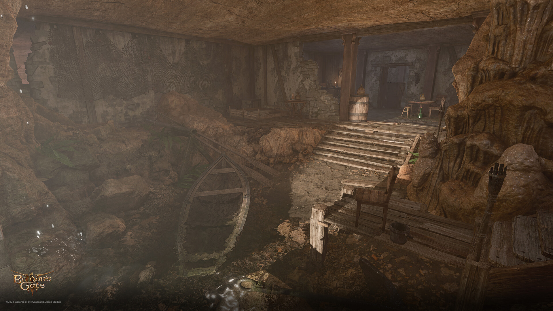 Hitting the lever opens a false wall revealing a living area with a makeshift dock and a half afloat rowboat. A table in the corner has some gold on it, together with a Silver Fork, a Rusty Dagger and a Scrapbook of Love Letters.