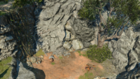 At X: -233 Y: 84 is an opening to a passageway under the rocky ridge. Inside, the straight path forward is littered with tripwires (each requires DC 15 Sleight of Hand check), also concealed with a Steam Cloud. Any of these tripwires trigger the eagle statue at the end of the passage to cast a Chain Lightning spell. The statue cannot be interacted with or disarmed.