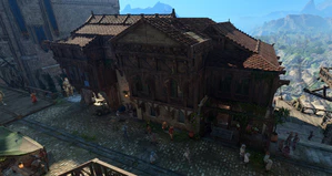Under the archway the party can trade with several vendors, offering various goods: Roberon Silt - paintings and dyes, and Velson Oakes - various plant-based Camp Supplies. Near the main entrance, on the wall, a Waypoint is located. Also, here the player character can witness several minor vignettes, all contributing to the Crossing's image as a place to find anything, any time. Near the entrance two citizens, Laila and Embry persuade their friend Hakeem to celebrate his birthday at the pleasure house, while at its far corner a Dragonborn Surixana tries to pawn off an "enhancement substance" to Cillian. To the West, Neno Quilltop, seemingly in a flap, is discussing with Kali Hammerhand whether they have bought everything necessary to flee from the city, while the latter tries to calm her down.
