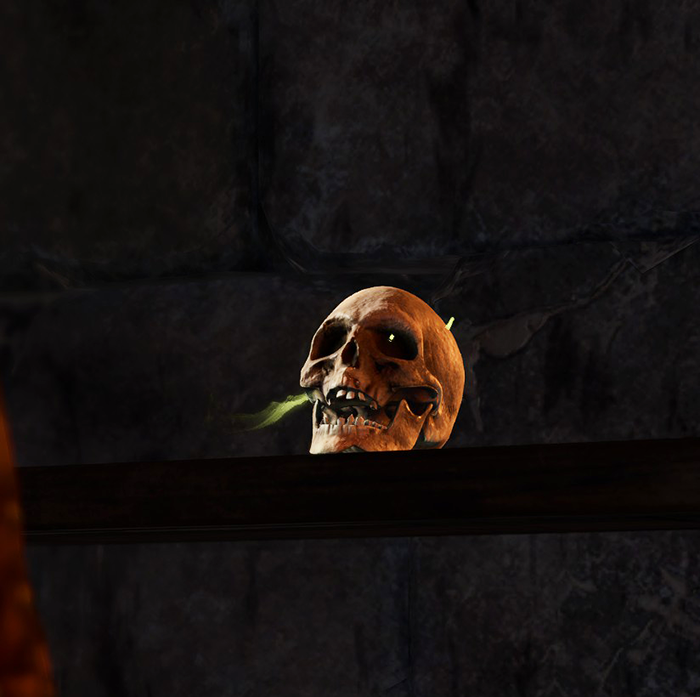 On the back wall of the cell are broken shelves, where the arrested party member can find the Unusual Skull. Even if not noticed at once, the skull attracts their attention with a cheerful greeting.