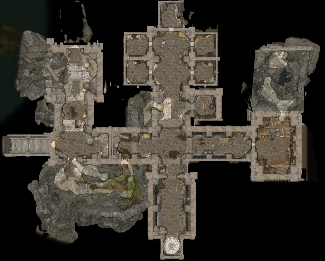 The main corridor has a rough T-junction form, with main enfilade connecting the cells' part and the entrance from the Wyrm's Rock Fortress. The side corridor connects it to the Storage Room, while through its short western appendix that grants the access to The Wyrmway. Both main and side corridors are constantly patrolled by Fist Ivarus.