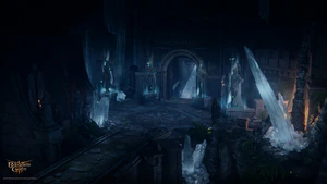 Past the new opening is the antechamber. At the far end is a locked door, and a statue of Balduran, resembling those posted throughout the city, beside it. Interacting with the door or statue enacts a dialogue, where the latter in poetic verses suggests the player character is worthy enough to meet Ansur. The Emperor intercedes, trying to talk the player character out of exploring the Wyrmway, however, without any perseverance. Calling themselves worthy results in the statue unlocking and opening the door with another proclamation. Also, companions can succeed a DC 15 Arcana Check to find out the statue is charmed with a Magic mouth spell.