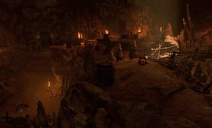 The cavern is occupied by the Zhentarim, an association of traders and mercenaries with dubious morals, who are using it as a base of operations in the region. Prior to the game events, however, the inn above their hideout was ransacked by goblins and drow. The Zhentarim are concerned the Flaming Fists might find the cavern while investigating, and are feverishly preparing to abandon and destroy the hideout in order to cover up any tracks of their activity. The cavern is already cluttered with Smokepowder Barrels, oily paths connecting them, and laden with unique type of traps, Proximity Explosives (see below).